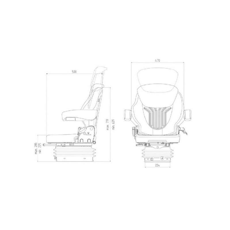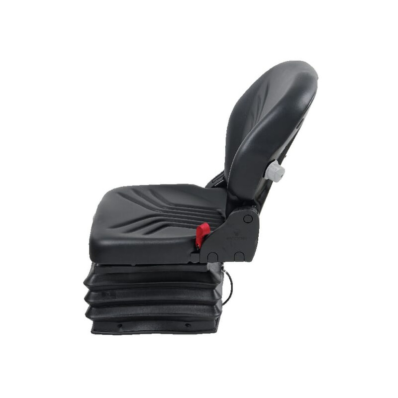 Ilgas aprašymas Taikymo sritis: Mažiems ir siaurų tarpvėžių traktoriams, statybinėms mašinoms ir mini ekskavatoriams Privalumai: Siūlo optimalų sėdynės komfortą mažiausiose erdvėse Sėdynę galima perstumti į reikiamą padėtį rankena. Aukščio reguliavimas 60 mm, bepakopis reguliavimas Horizontalus reguliavimas 210 mm Svoris 26 kg Atlošo pasvirimo reguliavimas Juosmens atrama, reguliuojamas mechaniškai