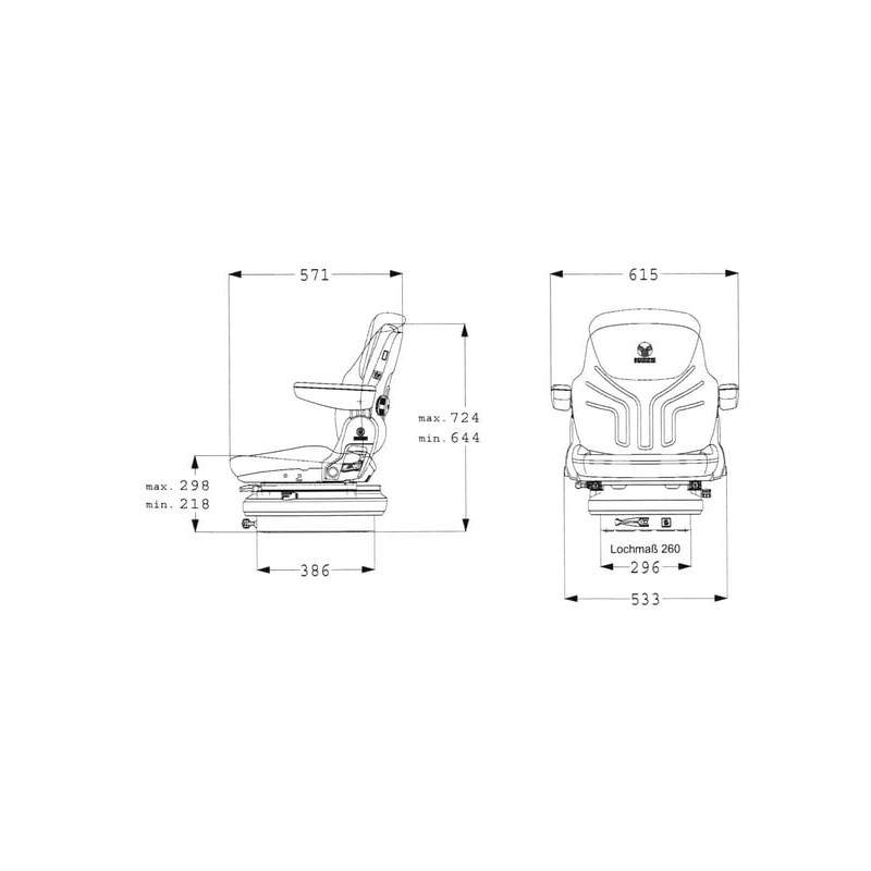 Ilgas aprašymas Taikymo sritis: Vidutinio dydžio ir sunkiems traktoriams su tiesia konstrukcija Privalumai: Siūlo optimalų sėdynės komfortą mažiausioje erdvėje Efektyviai apsaugo nuo stuburo disko pažeidimų; mechaniškai spyruoklinė sėdynė su mechaniškai reguliuojama juosmens atrama Sudeda: Sėdynė su porankiais, reguliuojamas aukštis ir sulankstomas 65 mm x 270 mm Be atlošo pailginimo Išsami informacija: Mechaninė sėdynė su kreipiančia pakaba ir hidrauliniais amortizatoriais Juosmens atrama, mechaniškai reguliuojama Savybės: Sėdynės plotis: 480 mm Mechaniškai reguliuojamas spyruoklės eiga: 10-60 mm. reguliavimas 210 mm Svorio reguliavimas 50–130 kg Svoris 35,3 kg Atlošo pasvirimo reguliavimas, maksimalus 35° Juosmens atramos pasvirimo reguliavimas Horizontali pakaba
