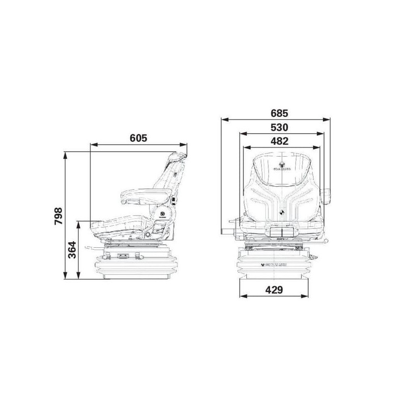 Ilgas aprašymas Taikymo sritis: Vidutinio dydžio ir sunkiems traktoriams su tiesia konstrukcija Privalumai: Itin patogi sėdynė Efektyviai apsaugo nuo stuburo disko pažeidimų Apsaugo nugarą nuo smūgių Žymiai sumažina vibraciją Kūno drėgmė pašalinama sveikatai kenkiančios vibracijos sumažintos 40 %. 20° Integruotas oro kompresorius (12 V) Detalės: Pneumatinė spyruoklinė sėdynė Visiškai automatinis svorio reguliavimas Su išilgine horizontalia pakaba, blokavimu Žemo dažnio pakaba Aktyvi pakaba Savybės: Sėdynės pagalvėlės plotis 550 mm Spyruoklės eiga: 120 mm Bepakopis aukščio reguliavimas 80 mm, oro pagalbinis reguliavimas 2 horizontaliai mm. 35° Juosmens atrama, pneumatinė Svorio reguliavimas 50–130 kg, elektroninis Svoris 58 kg Sėdynės šildymas (sėdynės ir sėdynės atlošas) APS: automatinė padėties nustatymo sistema