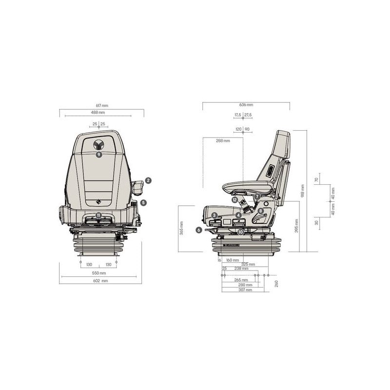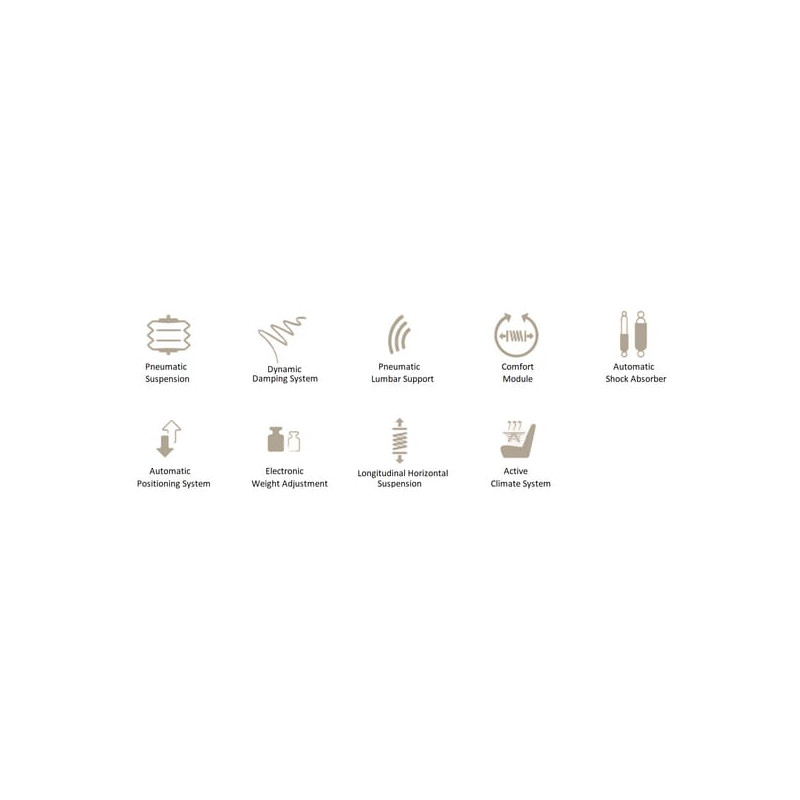 Išsamios oro spyruoklinės sėdynės su dinamine amortizavimo sistema ir aktyviu svorio reguliavimu (50 kg – 130 kg) Su šonine ir išilgine horizontalia pakaba Su sėdynės oro kondicionieriumi Aktyvi pakaba Reguliuojamas amortizatorius
