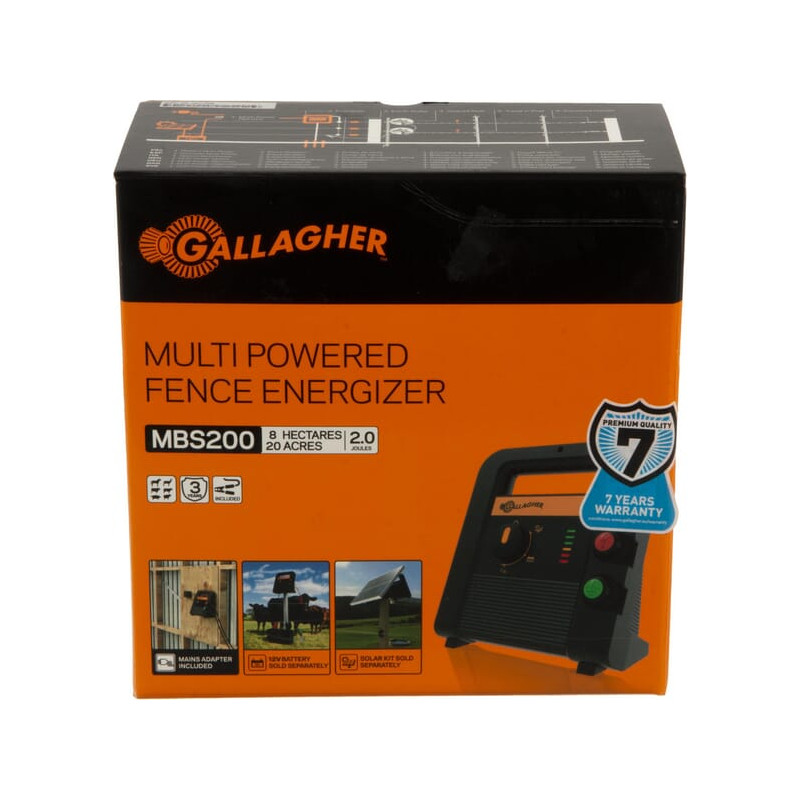 Išsami informacija apie gaminįMBS200 yra 3 viename kelių galių įrenginys. Tinka naudoti su saulės baterija, 12V baterija arba 230V. Prietaisą lengva nešiotis ir jis tinka iki 20 km tvoros. Jis pasižymi ūkiui atspariu dizainu, akumuliatoriaus valdymo funkcija ir įmontuota apsauga nuo žaibo. Yra prijungimo kabelių komplektas. Šiam elektros tvoros generatoriui naudokite 4 x 1 metro įžeminimo kuolą (art. 029020)