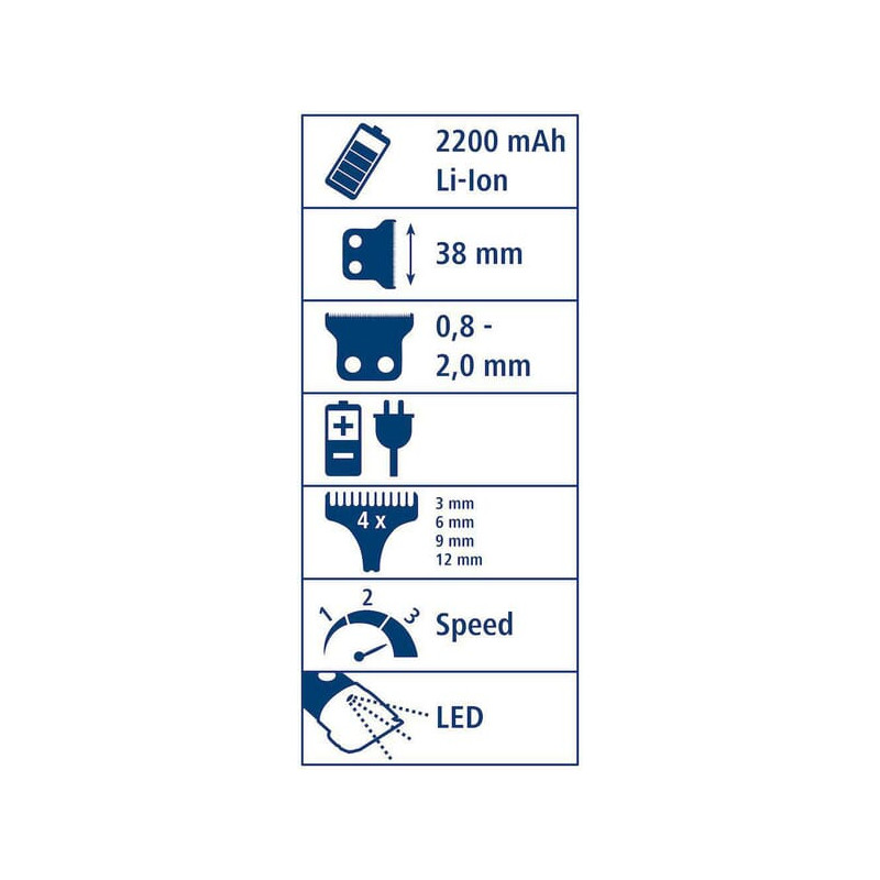 Papildoma informacija Skutimosi ilgis 0,8–2,0 mm Tiekiamas su 3, 6, 9 ir 12 mm šukos priedais, 3 greičiai 4000/5000/6000 aps./min.