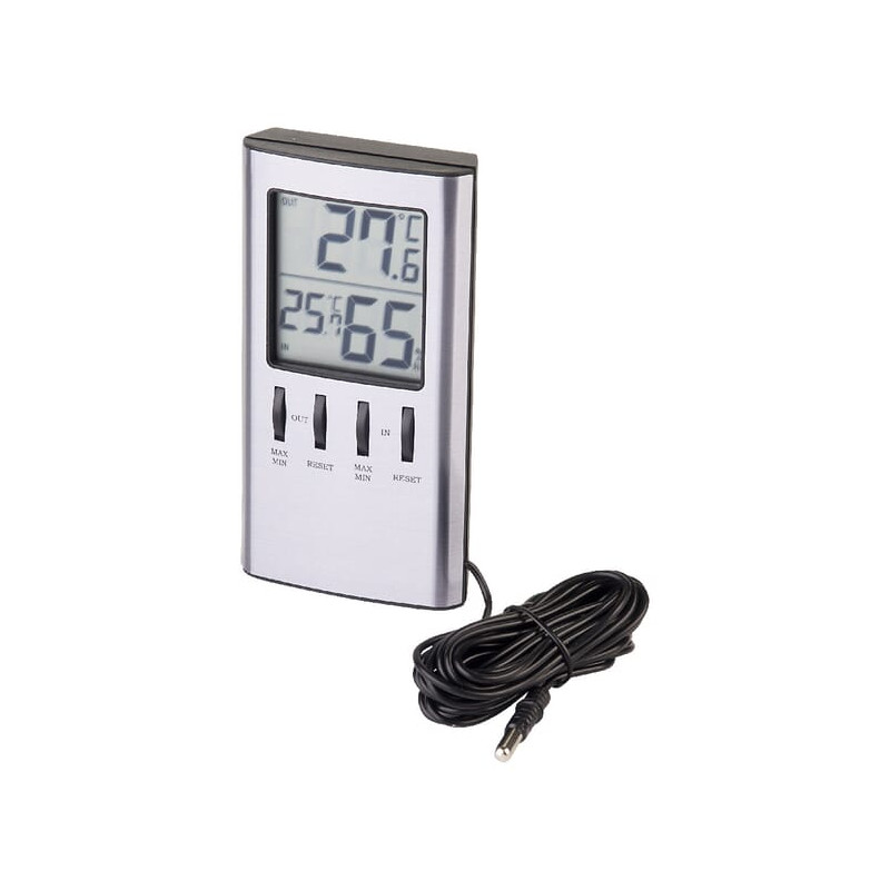 Ilgas aprašymasĮrenginys su dviem elektroniniais ekranais Termometras/higrometras Su 2 skaitmeniniais ekranais. Matuoja patalpų, lauko temperatūrą ir drėgmę patalpose. Maks./min. atmintis. Galima montuoti ant sienos arba stovėti ant stalo naudojant sulankstomą stalo stovą. Įskaitant baterijas.