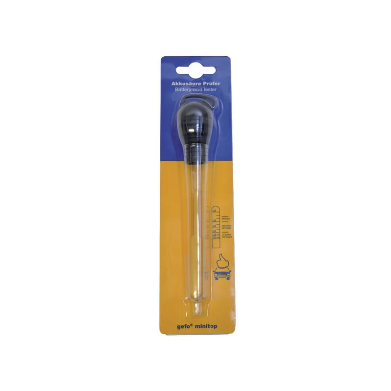 VienetasKiekvienas Prekės ženklasGefo Išsamus aprašymasRūgšties tankis akumuliatoriuje matuojamas naudojant rūgšties skalę. Savitasis tankis lemia akumuliatoriaus įkrovos būseną. Šis modelis yra mažas, tvirtas ir patikimas, o jo rodmenys tikslūs, įsiurbiant tik nedidelį kiekį skysčio. Akumuliatoriaus užpildymo antgalis turi riedėjimo ribotuvą ir pakabinimo angą.