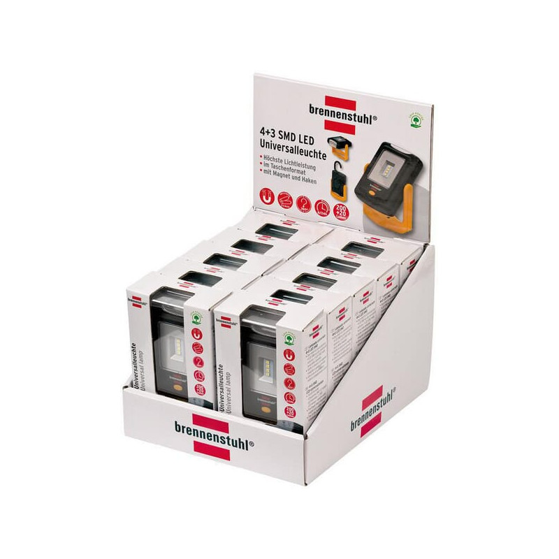 Vnt. vnt. GamintojasBrennenstuhl Produkto informacija Plastikinė rankena su integruotu magnetu, sulankstoma 360° kampu Techninė informacija Ryškus kišeninio dydžio šviestuvas, daugiafunkcis. 4 itin ryškūs SMD šviesos diodai priekyje, kurie šviečia daugiau nei 6 valandas, jei baterijos įkrautos. Papildomas perjungimo žingsnis 3 šviesos diodams šviestuvo galvutėje. Plastikinė rankena su integruotu magnetu, sulankstoma 360° kampu. 360° pasukamas, ištraukiamas pakabinimo kabliukas. Su įjungimo/išjungimo jungikliu. Supakuota skaidrioje dėžutėje su 10 colių ekranu. Šviesos diodai: 4 SMD + 3 CREE Lempučių technologija: nekeičiamos Šviesos srautas: 200 lm Veikimo laikas su baterijomis: 6 val. Baterijų skaičius: 3 Baterijų tipas: LR03 (AAA) Spalvos temperatūra: 6500 K Izoliacijos klasė: 20 Bendras ilgis: 34 mm Bendras plotis: 36 mm Bendras aukštis: 98 mm