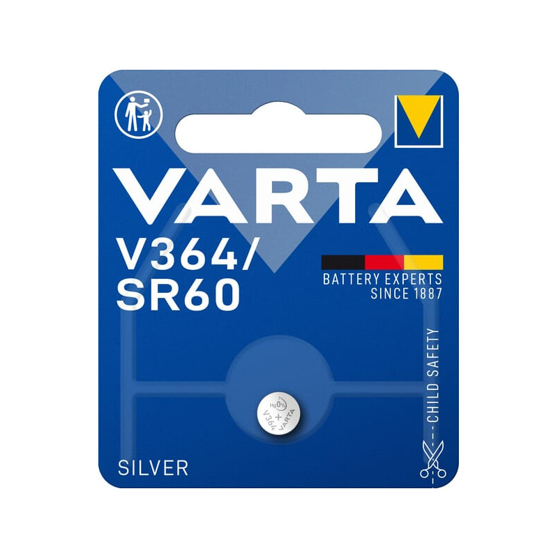 Dalies numeris VT00364 EAN4008496317059 Vnt./vnt. Gamintojas VARTA vartotojų baterijos Tipas V364 Įtampa 1,6 V Talpa 17 mAh·h Bendras plotis (skersmuo) 6,8 mm Bendras aukštis 2,2 mm