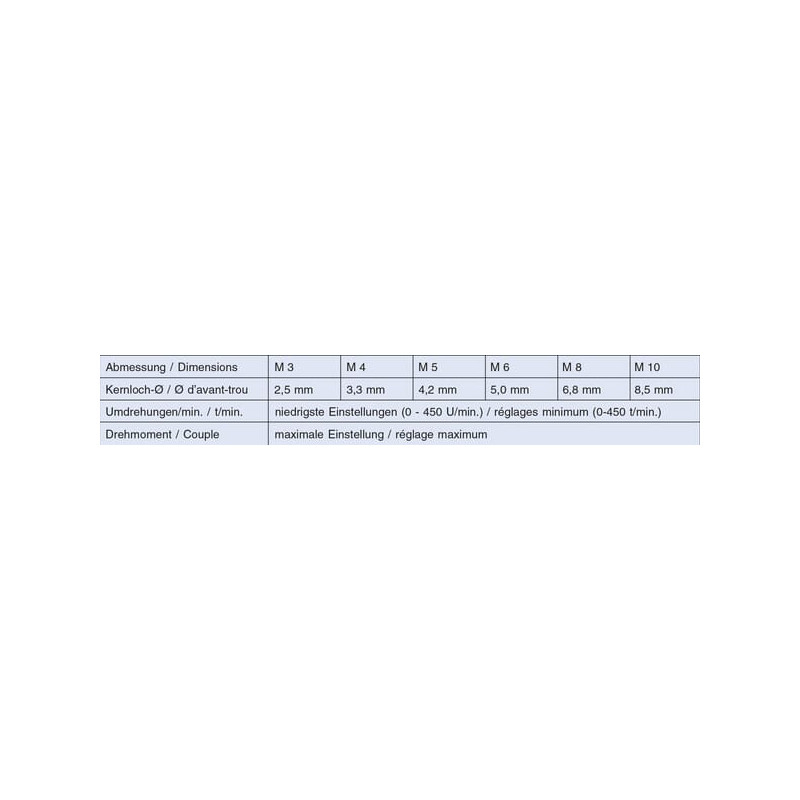 Dalies numeris TAS10 EAN4022835670469 Vnt./vnt. Gamintojas Völkel Sriegio tipas Metrinis Sriegio skersmuo M10 Sriegio žingsnis 1,50 mm L2 Sriegio ilgis 21 mm Sriegio kryptis Dešinė L1 Bendras ilgis 41 mm Srieginės skylės skersmuo 8,5 mm Koto kvadratinis plotis 6,3 mm Medžiaga Plienas HSS-G Tipo kodas D []