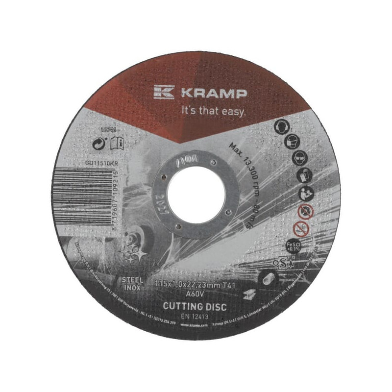 Dalies numerisGD11510KR EAN Vnt.Kiekvienas GamintojasKramp Išsamus aprašymas Aukštos kokybės Kramp pjovimo diskai, tinkami naudoti su plienu ir nerūdijančiu plienu, atitinka profesionalų reikalavimus. Skirti sudėtingiems ir sudėtingiems šlifavimo darbams metalo pramonėje ir amatininkystėje. Privalumai Mūsų naujausias Kramp pjovimo diskų asortimentas; dar daugiau! Ilgas tarnavimo laikas, sujungtas su dideliu efektyvumu; gali visiškai patenkinti aukštus profesionalių naudotojų poreikius Produkto informacija Efektyvumas padidėja dėl didesnio apdirbimo ir ilgesnio veikimo laiko Puikiai tinka plienui, konstrukciniam plienui, nerūdijančiam plienui, INOX ir legiruoto plieno paviršiams Puikiai tinka naudoti su mažai legiruoto plieno paviršiais ir ketumi Atitinka OSA saugos reglamentus ir Europos saugos standartą EN 12413 Disko skersmuo 115 mm Disko tvirtinimo angos skersmuo 22,23 mm Storis 1 mm Sukurta medžiagai Plienas Nerūdijantis plienas Forma Plokščia Formos kodas 41 Maksimalus sukimosi greitis 13300 aps./min. Maksimalus sukimosi greitis 80 m/s Parduodamo vieneto turinys 25 vnt.
