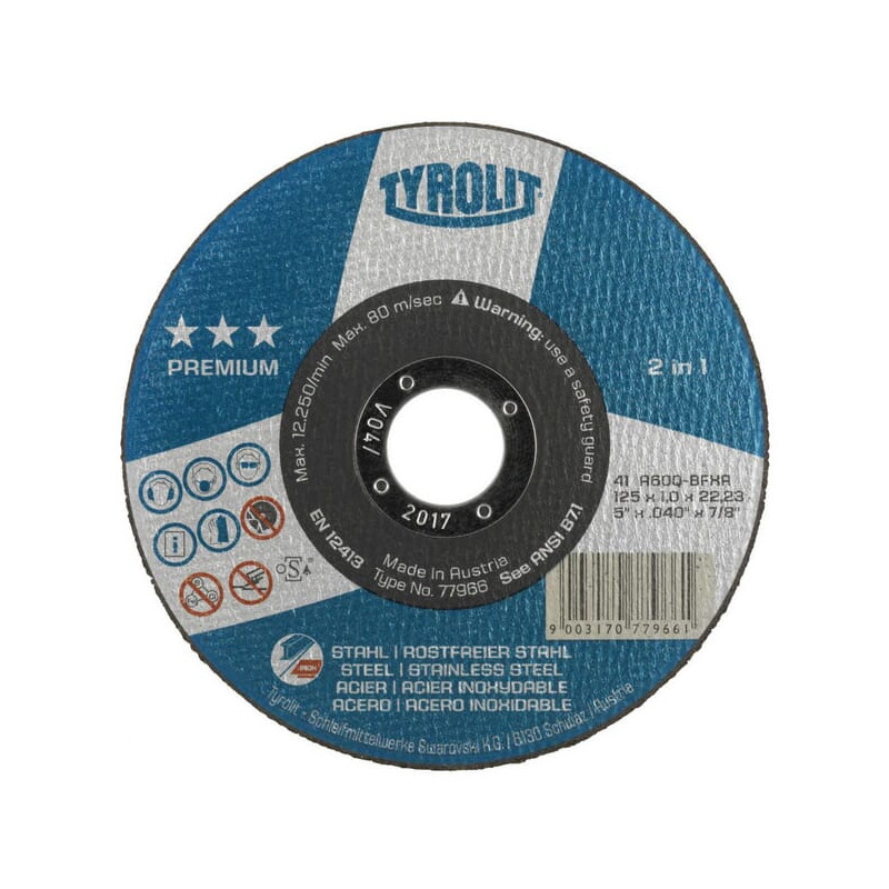 Dalies numeris 872346 EAN9003178723468 Vnt./vnt. Gamintojas Tyrolit Taikymo sritis Plienui ir nerūdijančiam plienui Kampiniams šlifuokliams Savybės Paprastas 2 viename šlifavimo diskas su plokštelėmis Geras apdirbimas Ilgas tarnavimo laikas Disko skersmuo 115 mm Disko tvirtinimo angos skersmuo 22,23 mm Storis 2,5 mm Skirta medžiagai Nerūdijantis plienas Plienas Formos kodas 42 Grūdėtumo kodas 30 Maks. sukimosi greitis 4800 aps./min. Maks. sukimosi greitis 80 m/s Parduodamo vieneto turinys 25 vnt.
