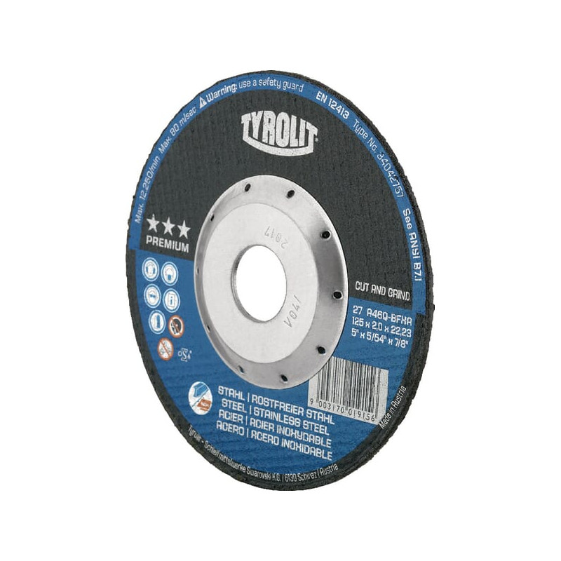Dalies numeris 34042757 EAN9003170019156 Vnt./vnt. Gamintojas Tyrolit Techninė informacija. Aukščiausios kokybės 2 viename diskas. Diskas saugiam pjovimui ir šerpetojimui šalinti. Naudojimas: plienui ir nerūdijančiam plienui. Tinka kiauryminiam pjovimui suvirinimo siūlėse. Disko skersmuo 125 mm Disko tvirtinimo angos skersmuo 22,23 mm Storis 2 mm Skirta medžiagai: nerūdijantis plienas, plienas Formos kodas 27 Grūdėtumo kodas 46 Maksimalus sukimosi greitis 4320 aps./min. Maksimalus sukimosi greitis 72 m/s