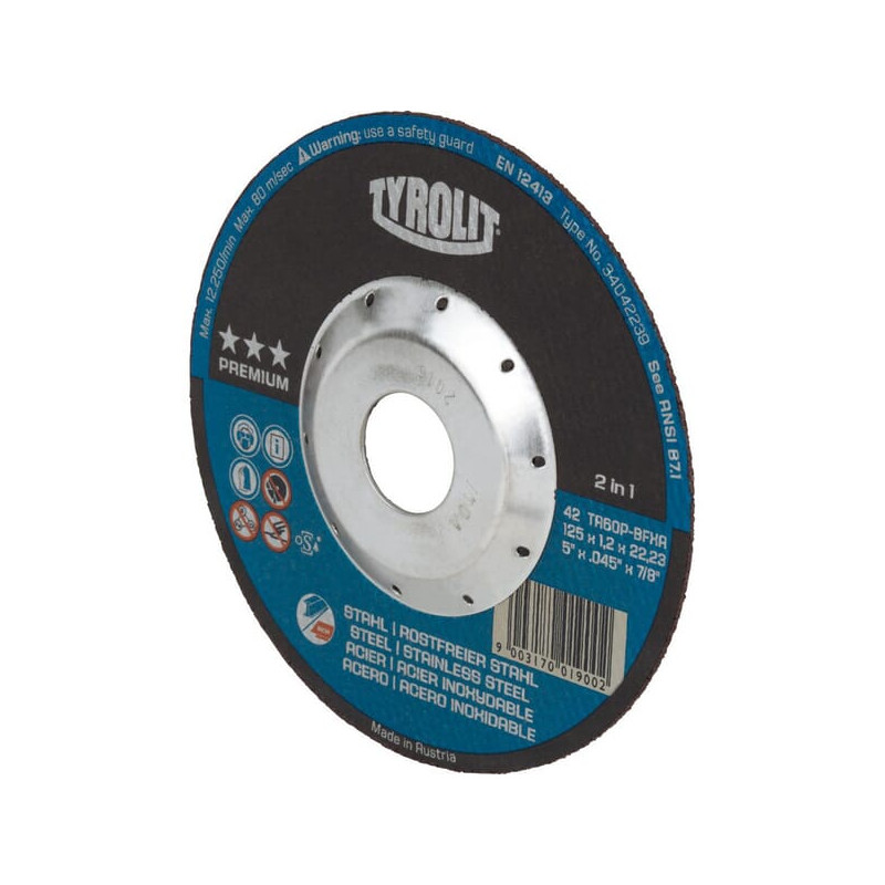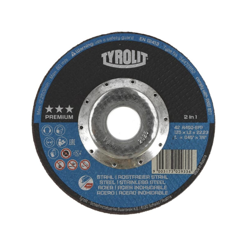 Dalies numeris 34472852 EAN9003173029336 Vnt./vnt. Prekės ženklas Tyrolit Išsamus aprašymas Aukščiausios kokybės „Tyrolit“ pjovimo diskai su apsauga nuo gilaus įpjovimo, kiaurymė turi apsaugą nuo išlūžimo. Privalumai Šlifuoklis gali visiškai įsiskverbti į ruošinį ir prisiliesti prie aštrių ruošinio kraštų nepažeisdamas disko. „Deep Cut Protection“ technologija užtikrina dar didesnį naudotojo saugumą. Didesnis komfortas dėl puikaus pjovimo našumo. Produkto informacija Skirta įvairių rūšių plienui ir nerūdijančiam plienui apdirbti Pjaustyti lakštus, profilius, vamzdžius, strypus ir kietas medžiagas Disko skersmuo 125 mm Disko tvirtinimo kiaurymės skersmuo 22,23 mm Storis 1,2 mm Skirta medžiagai Plienas Nerūdijantis plienas Forma Diskas Formos kodas 42 Grūdėtumo kodas 46 Maksimalus sukimosi greitis 80 m/s []