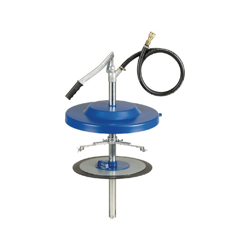 Savybės Tiekiama terpė: Tepimo tepalas pagal NLGI 2 Slėginės pusės tepalo jungtis: „Rectus“ 72 tipo jungtis tepalo įmovai Žarnos ilgis: 1500 mm Paviršiaus apdorojimas: visos plieninės dalys yra cinkuotos Tepalo transportavimas: su svirtimi Tepalo sekimo stūmoklis: kūginiam plastikiniam konteineriui, 25 kg Siurblio galvutė: smūgiams atsparus cinko liejinys Siurblio korpusas: plienas Dulkių dangtelio dažai: mėlyni, Pantone 294 C