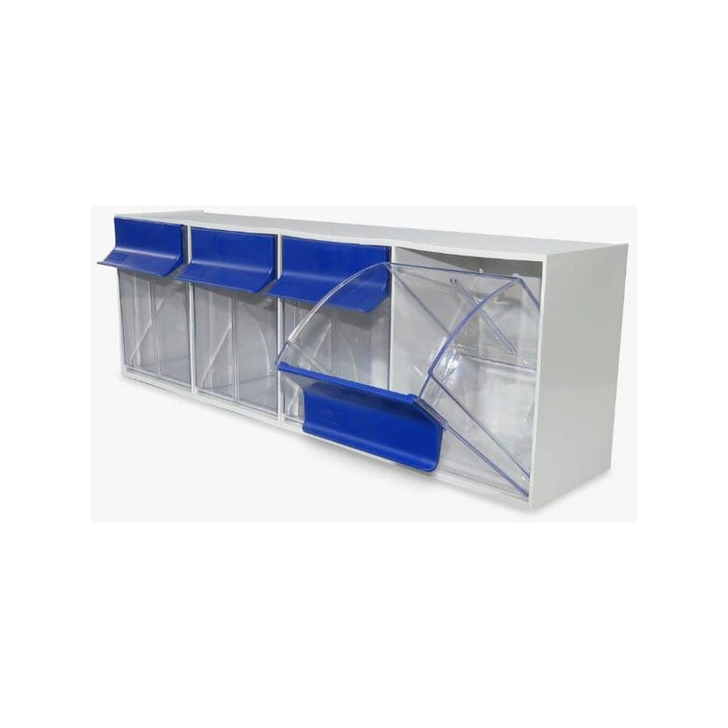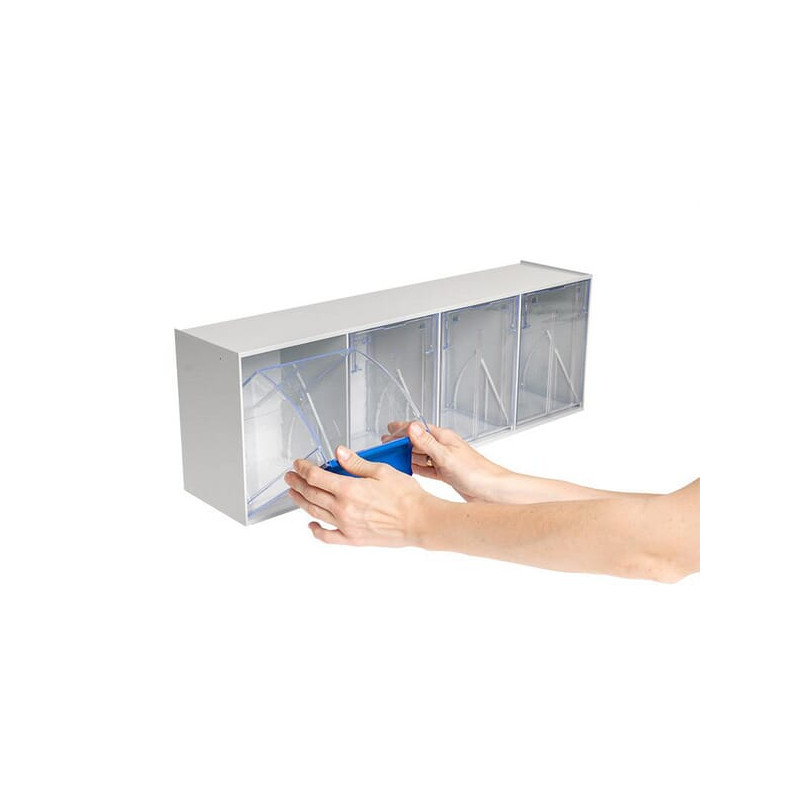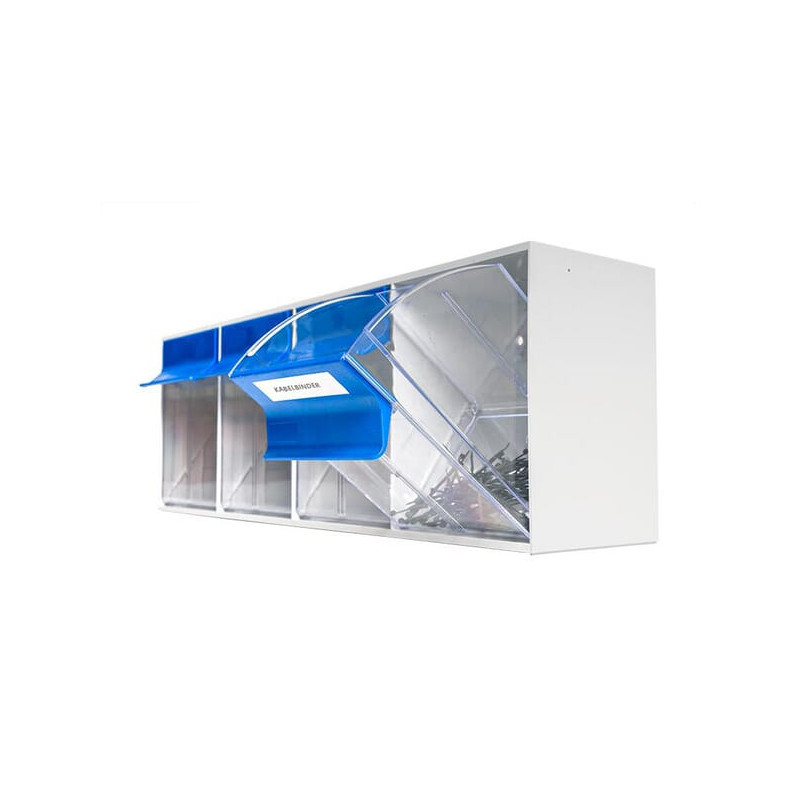 PrivalumaiSandėliavimo sistema pagaminta iš smūgiams atsparaus polistireno, lengvai sudedama ir skirta stabiliam tvirtinimui prie sienosNuimami pakreipiami stalčiai, pagaminti iš skaidraus polistireno, su integruotais etikečių laikikliaisTurinio saugojimas be dulkių ir matomas