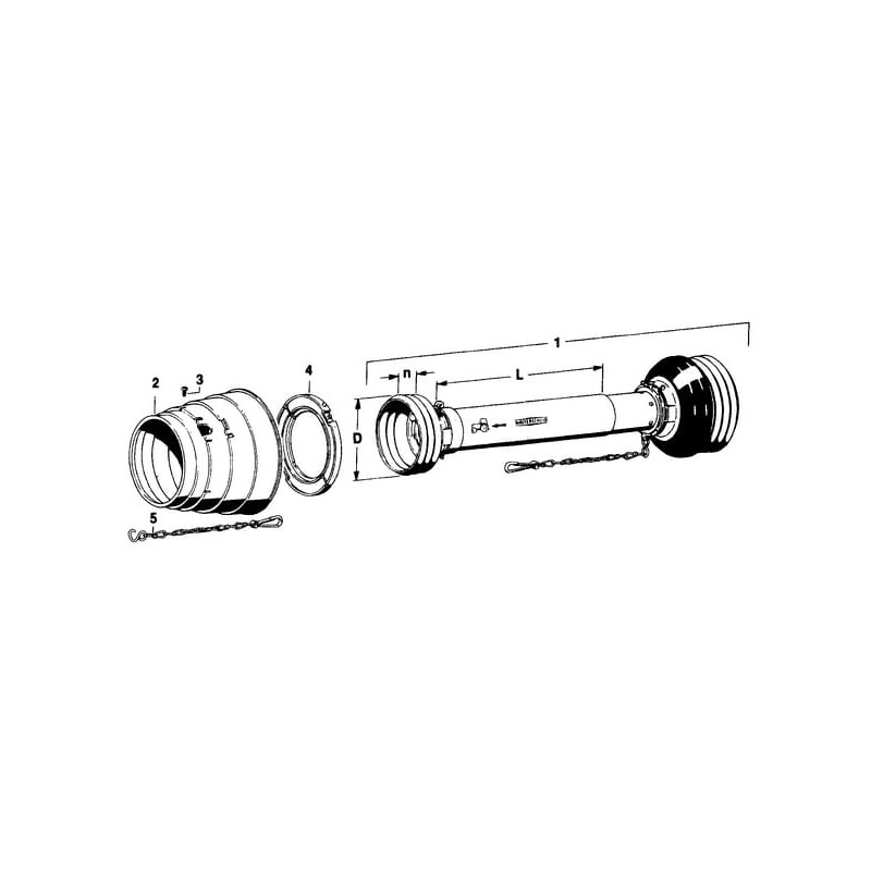 Sudaro:SD tipo kardaninio veleno apsauga su 1 šoniniu sutrumpintu apsauginiu piltuvu2 kreipiamieji žiedai (profiliniam vamzdžiui)2 saugos grandinės. Plataus kampo piltuvas, saugos grandinė, plataus kampo kreipiamasis žiedas ir varžtai užsakomi atskirai