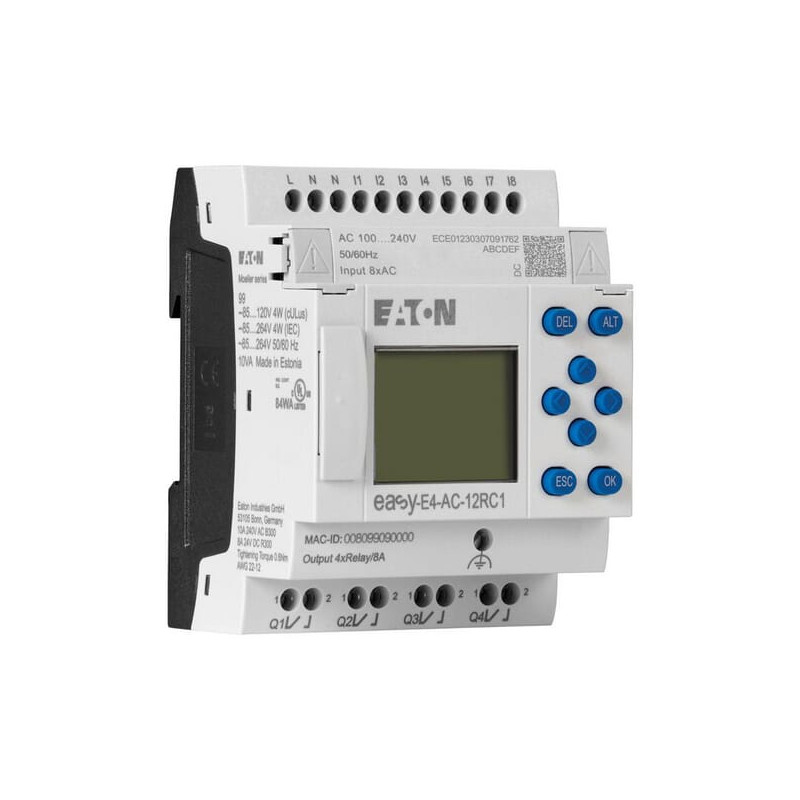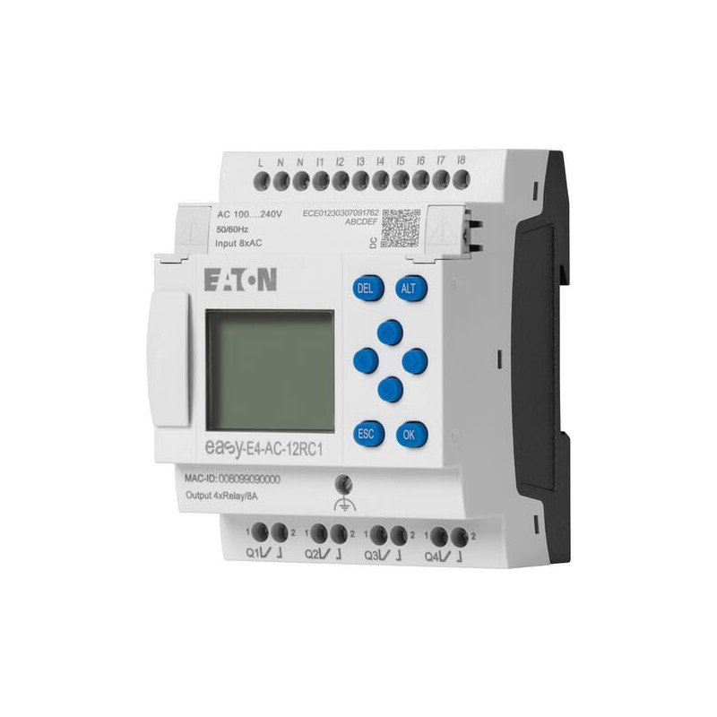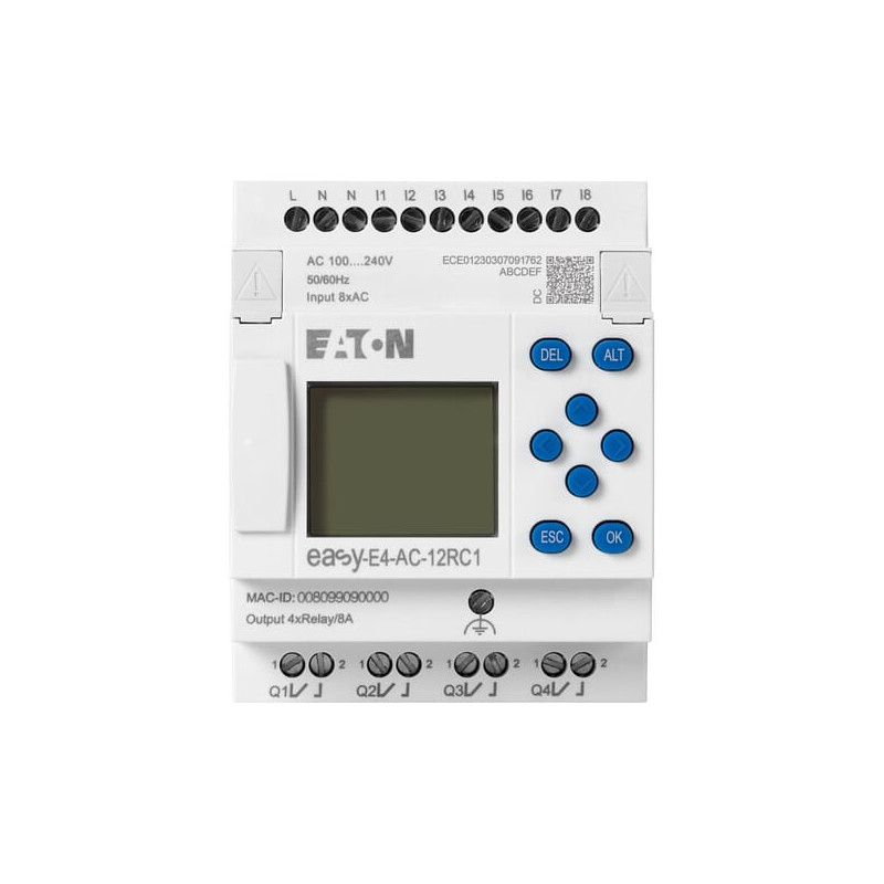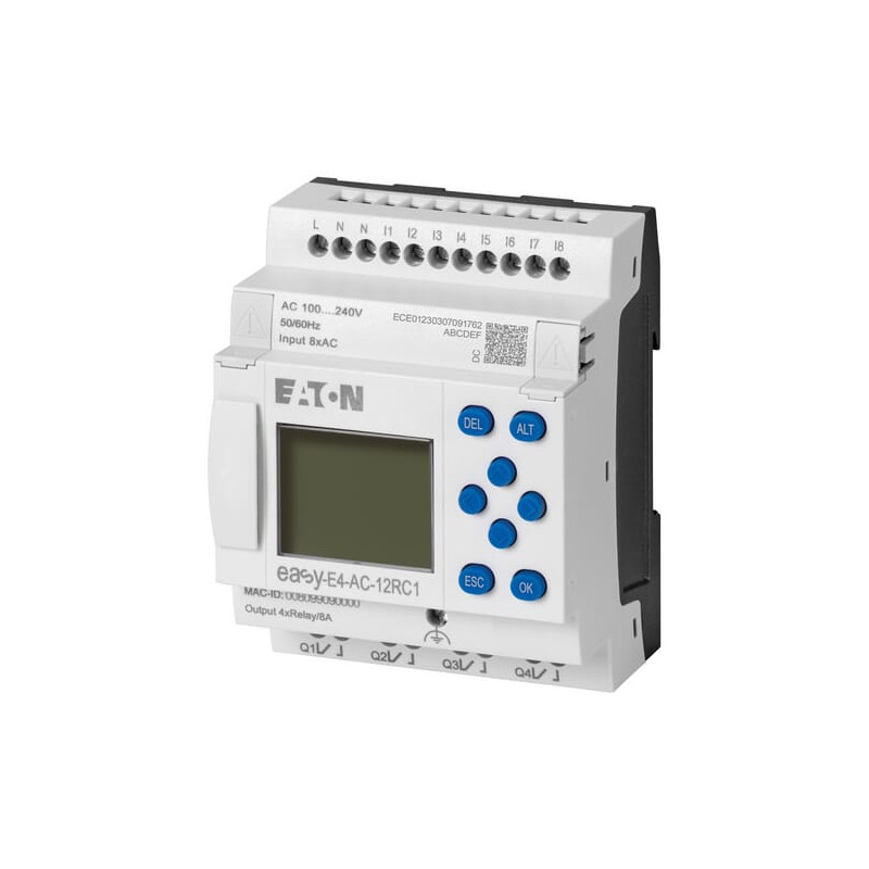 Produkto informacijaDaugiausia 11 vietinių išplėtimo modulių vienam baziniam įrenginiui. 188 galimi įėjimai ir išėjimai vienoje „easyE4“ sistemoje. Platus įtampos diapazonas (nuolatinė, kintamoji ir UC). Integruota Ethernet sąsaja, užtikrinanti platų ryšio galimybių pasirinkimą. Programavimo aplinka su 4 programavimo kalbomis (ST, FBD, LD, EDP). Su LCD ekranu. 3 spalvų foninis apšvietimas: balta, raudona ir žalia. Foninis apšvietimas turi 3 pritemdymo nustatymus. Pertraukimo įėjimai. Integruotas Ethernet ir integruotas žiniatinklio serveris. Integruotas „microSD“ lizdas.