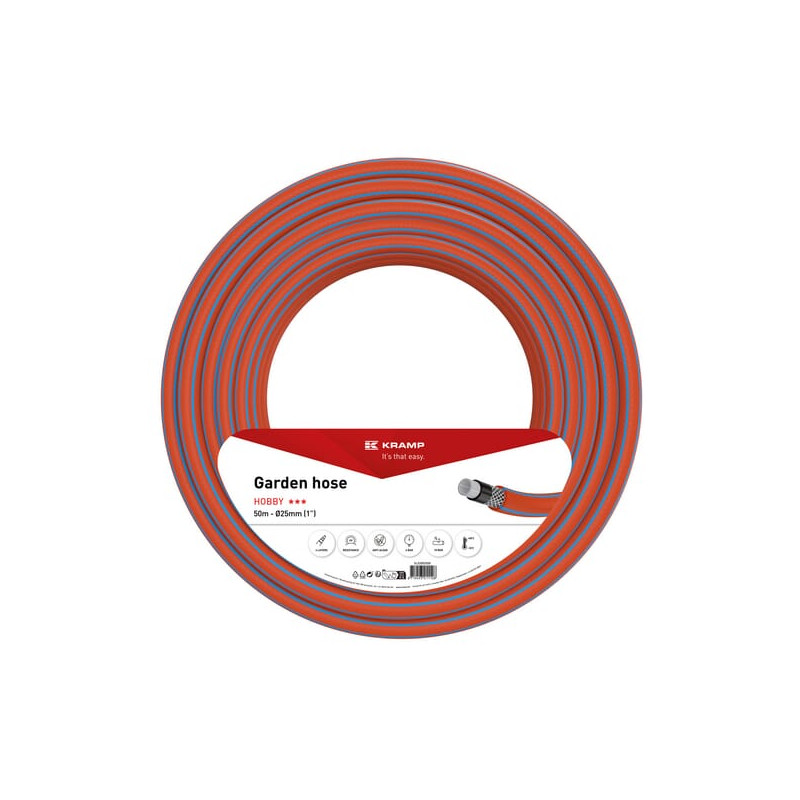 Produkto informacija Lengva vandens žarna, skirta retkarčiais naudoti drėkinimo ir valymo srityse žemės ūkio, statybos ir pramonės sektoriuose. Poliesterio kryžminis sutvirtinimas užtikrina gerą atsparumą slėgiui. Pagaminta iš PVC, kuriame nėra ftalatų, kadmio, bario ir švino, žarna yra atspari UV spinduliams ir dilimui, išlaikant lankstumą net žemoje temperatūroje. Konstrukcija: 4 sluoksnių struktūra: kryžminis sutvirtinimas, vidinis sluoksnis – baltas PVC (atsparus dumbliams), vidurinis sluoksnis – juodas PVC su iki 45 % perdirbtų medžiagų, išorinis sluoksnis – oranžinis PVC su 4 mėlynomis juostelėmis. Darbinė temperatūra: −10/+50°С