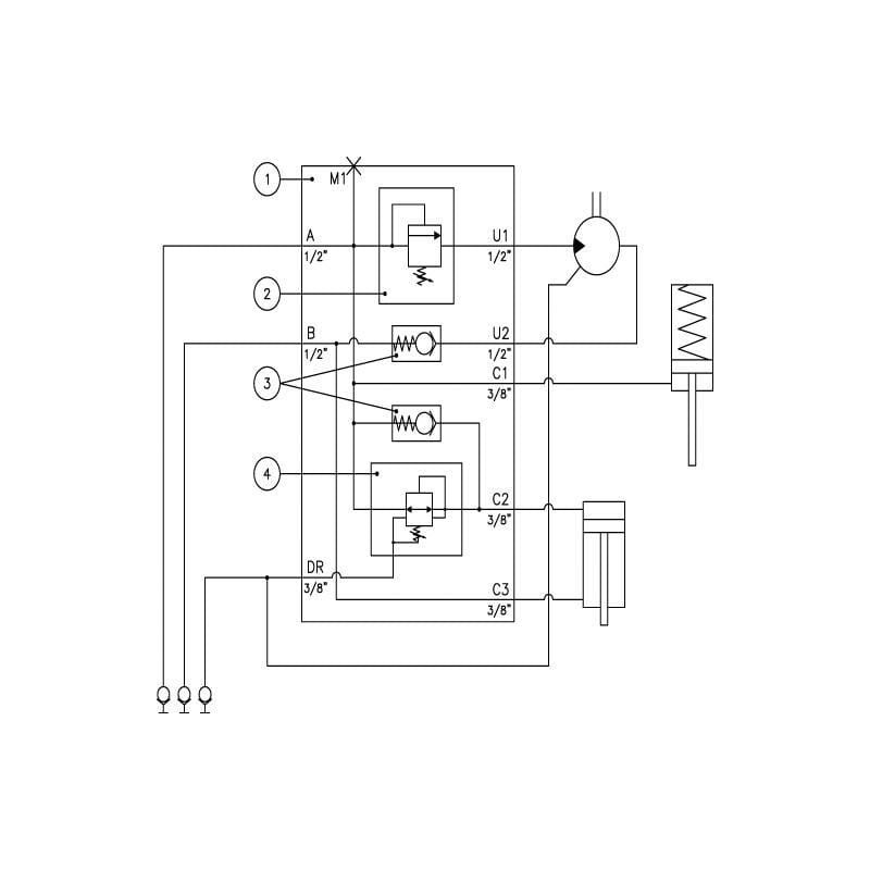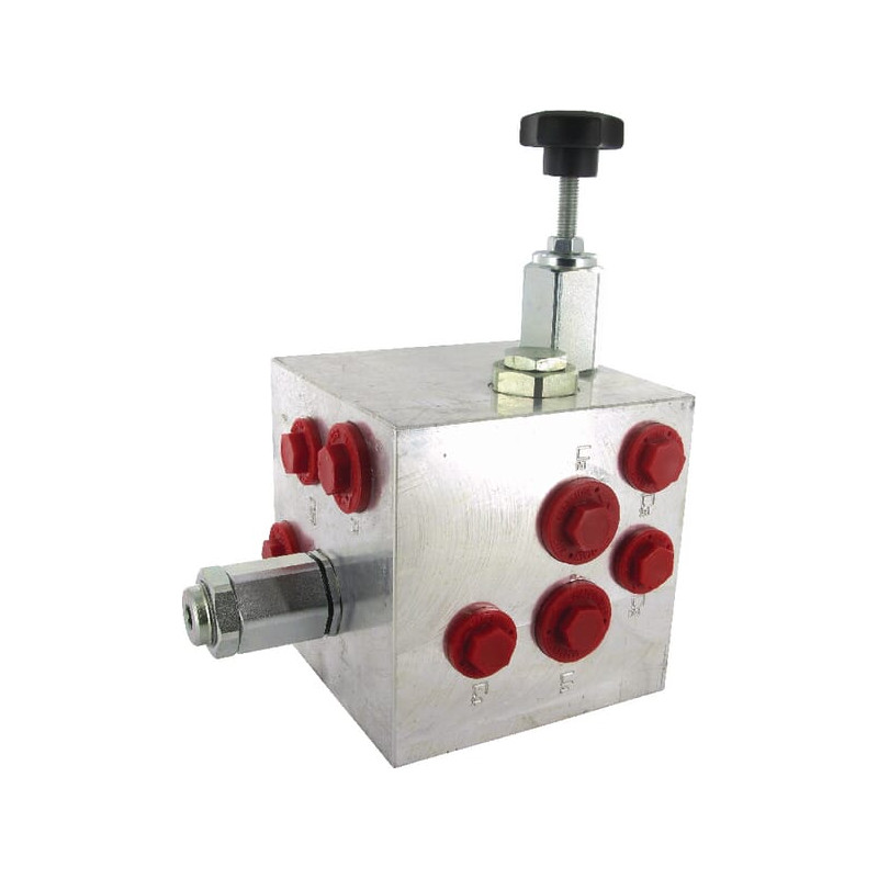 SavybėsReguliuojamas slėgio į žemę valdymasKonfigūracija per jungikliusHidraulinis variklis su galimybe keisti sukimosi kryptįBlokas neturi integruoto atbulinio vožtuvo, todėl kėlimo cilindras gali nukristi, jei atsiranda vidinis nuotėkisT jungtis turi būti tiekiama į baką be slėgioNaudojama kartu su dvigubo veikimo vožtuvuAlyvos nuotėkio jungtis slėgio mažinimui ir hidrovarikliui. Sandarinimo medžiaga: Buna