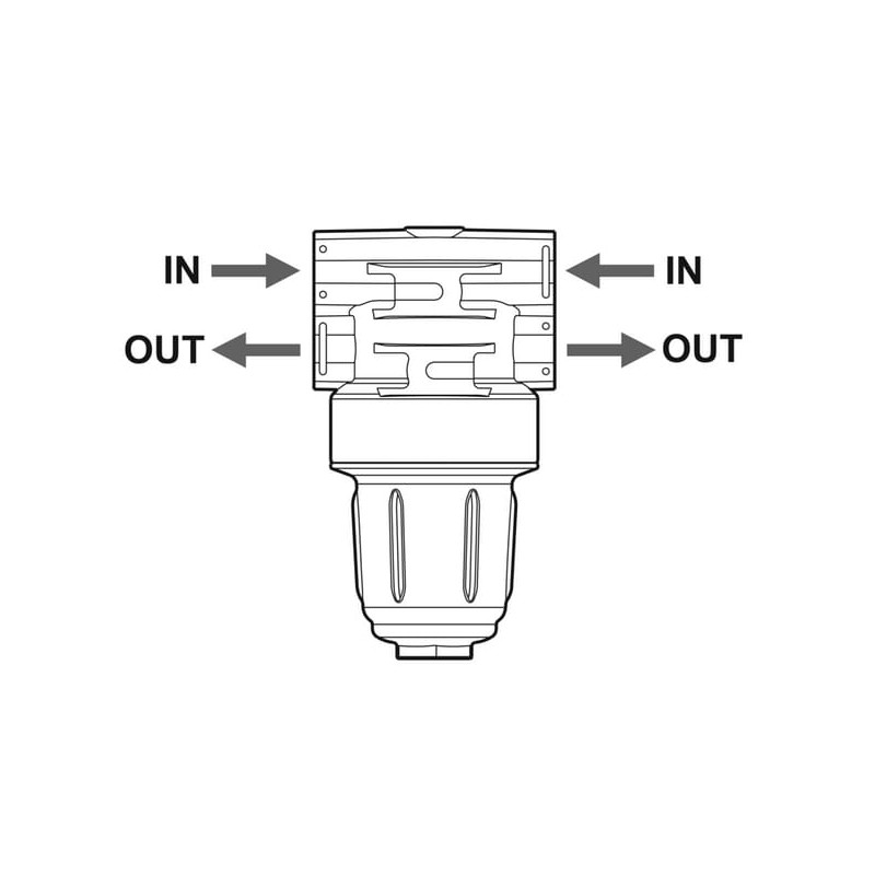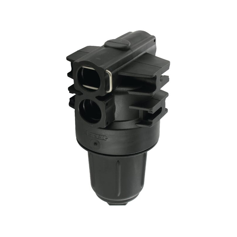 Savybės Korpusas pagamintas iš stiklo pluoštu sustiprinto nailono Viton® sandarikliai Atšakos jungtis: dviguba iš abiejų pusių, tiekiama su dviem atviromis ir dviem uždaromis (pasirinktinai) jungtimis. Papildomas jungtis galima atidaryti tiesiog gręžiant Patentuotas filtro tvirtinimas, leidžiantis jį pritvirtinti iš abiejų pusių