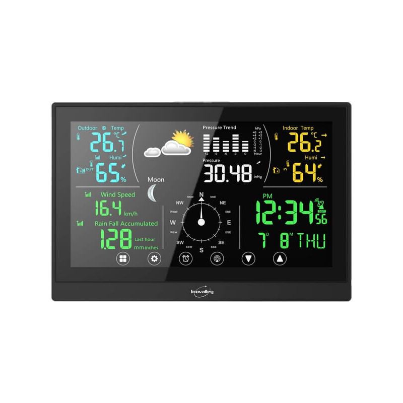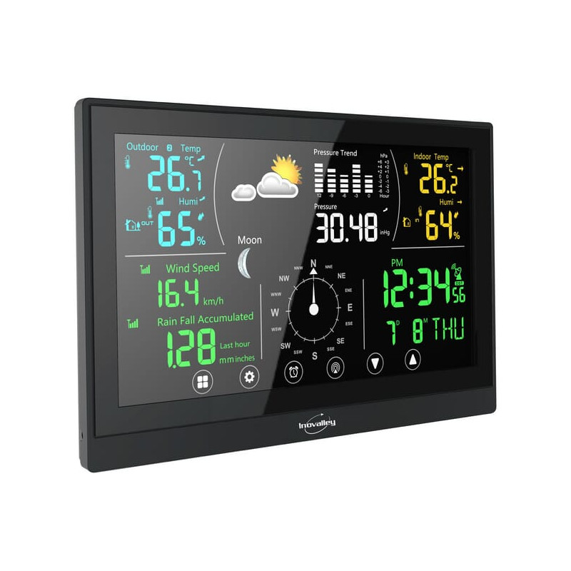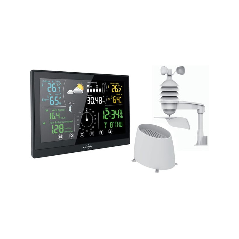 PrivalumaiSpalvoto ekrano meteorologinė stotelė su jutikliniais mygtukais Orų prognozė su barometru Orų piktogramų rodymas Vidaus ir lauko temperatūros bei drėgmės rodymas Temperatūros / drėgmės tendencija Temperatūros rodymas °C arba °F Temperatūros įspėjimas Anemometro funkcija Vėjo kryptis ir greitis Kritulių matuoklio funkcija Kritulių registravimas Mėnulio fazės Radijo bangomis valdomas laikas 12/24 valandų formatas Žadintuvas su snaudimo funkcija Kalendorius su datos / dienos / mėnesio rodymu RF dažnis: 434 MHz Vidaus temperatūros diapazonas: -9,9 °C ~ 50 °C Lauko temperatūros diapazonas: -50 °C ~ 70 °C Drėgmės diapazonas: 1 % ~ 99 % RH