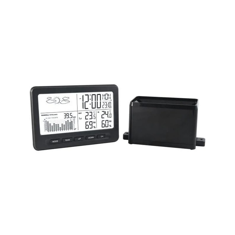 Produkto informacijaBaltas apšviestas ekranas Belaidis temperatūros ir kritulių perdavimas (434 MHz) Kritulių istorija (1 valanda, 2 valandos, 24 valandos, savaitė ir mėnesis) Kritulių juostinė diagrama Orų prognozės piktogramos Vidaus ir lauko temperatūra ir drėgmė su min/max atmintimi Temperatūros tendencija (kylanti arba pastovi) Programuojamas temperatūros įspėjimas Temperatūra °C arba °F Vidaus temperatūros diapazonas: nuo -10° iki +50°C Vidaus drėgmės diapazonas: nuo 20 iki 95 % (±5 %) Lauko temperatūros diapazonas: nuo -50°C iki +60°C Lauko drėgmės diapazonas: nuo 20 iki 95 % (±5 %) Laikas su 12/24 valandų formatu Žadintuvas ir snaudimo funkcija Kalendorius su savaitės dienos rodymu (kalbos pasirinkimas) Baterijos nepridedamos: centrinis blokas 3 AAA 1,5 V baterijos + lietaus apsauga 2 AAA 1,5 V baterijos Pridedamas USB laidas ir tinklo adapteris